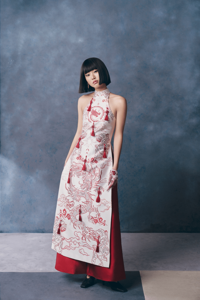 Trong văn hóa Á Đông, màu đỏ tượng trưng cho sự may mắn và thịnh vượng. Sắc đỏ mang đến cảm xúc mãnh liệt nhưng cũng đầy trang trọng và quý phái. Trong thời trang, để thu hút sự chú ý, đặc biệt là các dịp lễ hoặc mùa nghỉ dưỡng, các thương hiệu thường sử dụng màu sắc rực rỡ để gây ấn tượng với người mua cũng như tạo điểm nhấn khác biệt trong dòng sản phẩm định kỳ. Áo dài được cách điệu bằng các tầng layer liên tiếp, cũng có thể tinh giản hết mức bởi màu đỏ vốn dĩ đã sẵn sàng nổi bật cho cái chạm tinh tế trong nét đẹp Á Đông. Với chiếc áo dài, dù là kiểu dáng tân thời hay truyền thống, dù cầu kỳ hay tinh giản, chỉ cần có sắc đỏ đã đủ tôn lên nét đẹp trọn vẹn. Để phối cùng sắc đỏ, người mặc có thể lựa chọn phụ kiện tối giản như mắt kính dáng tròn từ CHANEL hoặc một chiếc túi kinh điển từ Gucci Bamboo.