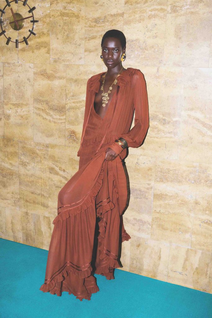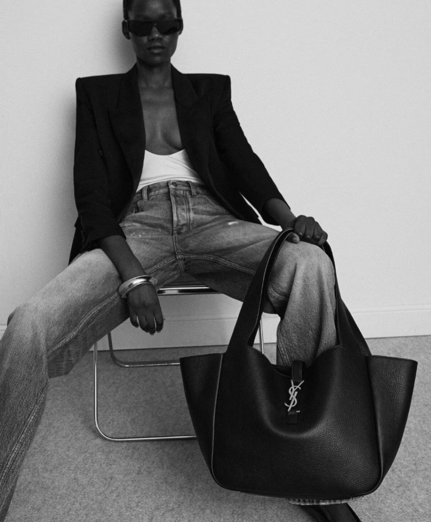 Khi ánh hoàng hôn phủ lên ngày cuối tuần, vẻ rực rỡ được tiết chế trong tinh thần tối giản. Chiếc đầm cắt xẻ táo bạo từ Saint Laurent kết hợp với khuyên tai cách điệu của Alaïa và túi cói Saint Laurent, tựa bản hòa ca nhuộm sắc sa mạc ngày hạ. Vòng cổ thánh giá từ Daisy Molecule cũng góp phần thêu dệt vẻ đài các, nâng tầm diện mạo cho người mặc. Cuối cùng, làn hương mơ màng English Pear & Sweet Pea của Jo Malone sẽ đánh thức mọi giác quan, cân bằng giữa nét tinh khôi và quyền lực, biến từng bước chân thành tuyên ngôn lấp lánh giữa giấc mộng hè.