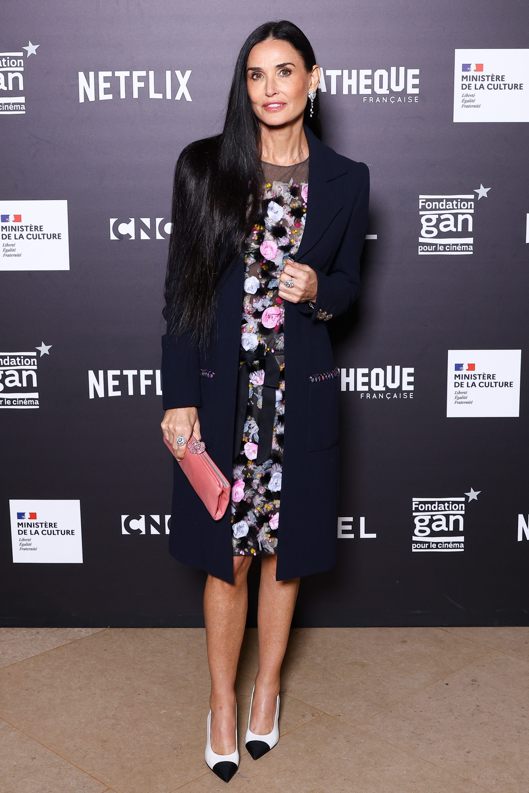 Ngôi sao người Mỹ Demi Moore, diễn viên chính trong “The Substance”, diện một chiếc đầm dáng suông làm từ vải tuyn, tô điểm bởi những bông hoa organza đa sắc và lông vũ tinh xảo. Kết hợp cùng chiếc áo khoác vải len crepe màu xanh hải quân với đường viền sang trọng, bộ trang phục tạo nên vẻ thanh lịch pha lẫn hiện đại, đặc trưng cho phong cách của CHANEL.