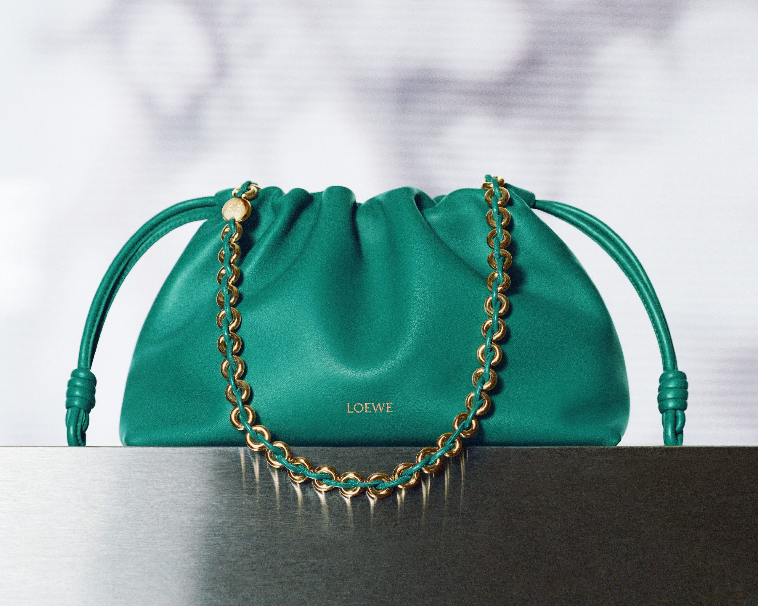 Túi xách Flamenco màu xanh ngọc bích của LOEWE với dây xích vàng nổi bật