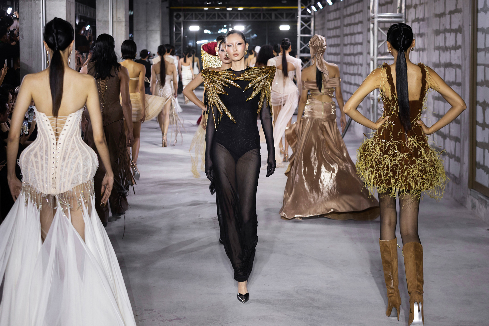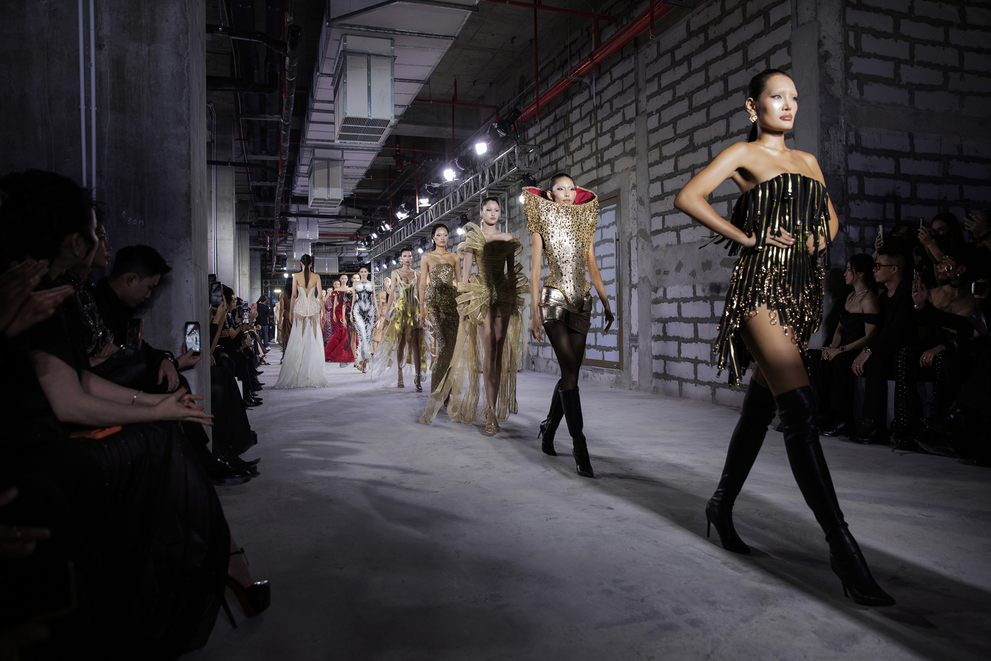 Khi buổi trình diễn chuyển sang chương “tái sinh”, BST trở nên mềm mại hơn với lụa, ren và lưới mảnh. Trên các thiết kế, chất liệu ren thêu hiện lên như những vệt tro mờ ảo, khoe khéo đường cong của người mẫu mà không đánh mất tính thanh nhã. Kỹ thuật draping, đính kết ánh kim và dựng phom 3D hiện đại được ứng dụng để tạo nên những thiết kế gợi cảm nhưng mang tinh thần couture hiện đại. Màu sắc cũng chuyển dần sang san hô, vàng và đỏ, như biểu tượng của sự sống mới.