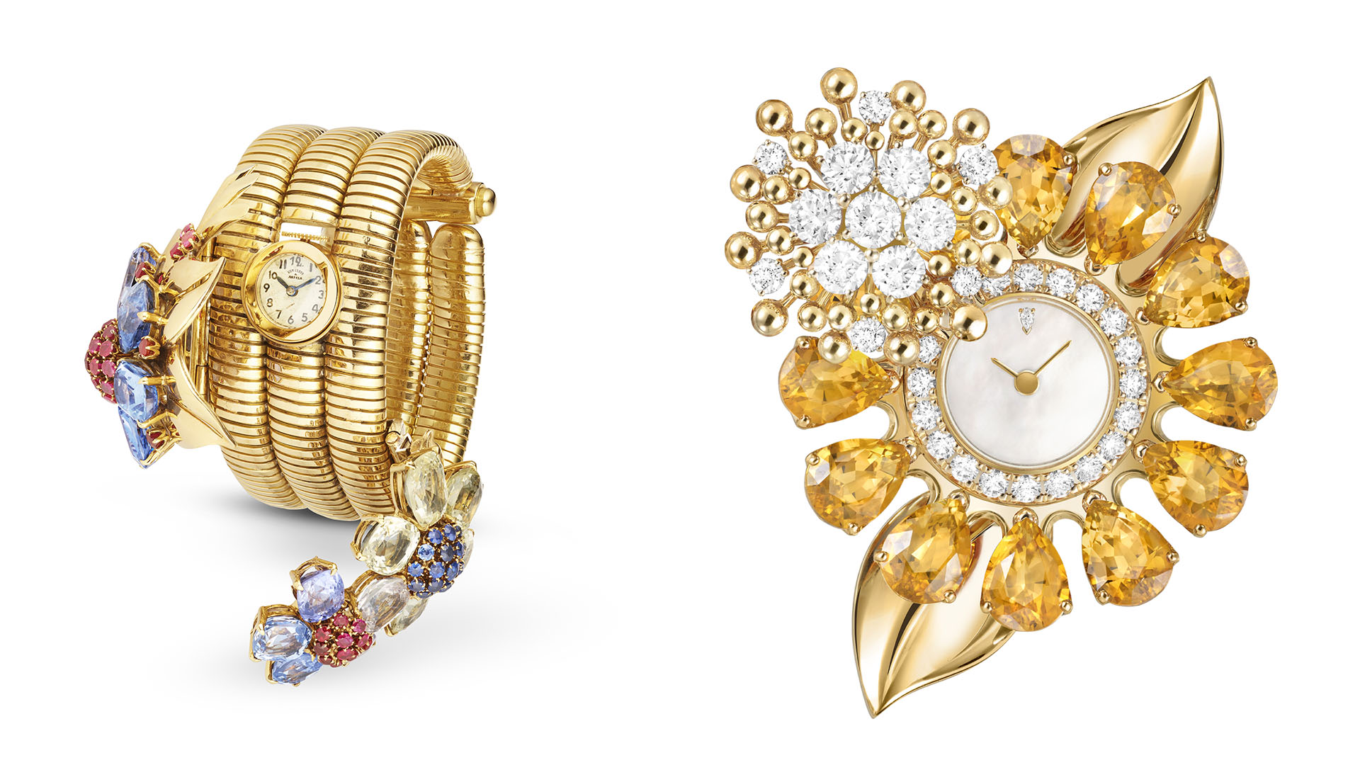 Để tạo ra những thiết kế này, Van Cleef & Arpels đã tỉ mỉ lựa chọn năm loại đá quý cao cấp – Citrine, Amethyst, Rhodolite, Aquamarine và Peridot – để tô điểm cho các mẫu hoa tai, nhẫn, mặt dây chuyền và đặc biệt là những chiếc đồng hồ bí mật độc đáo. Mỗi viên đá được tuyển chọn theo tiêu chí khắt khe về cường độ màu sắc, độ trong và chất lượng cắt, đặc biệt là kiểu cắt hình giọt lệ (pear-cut) cân đối, nhằm tôn lên vẻ đẹp của đá quý.