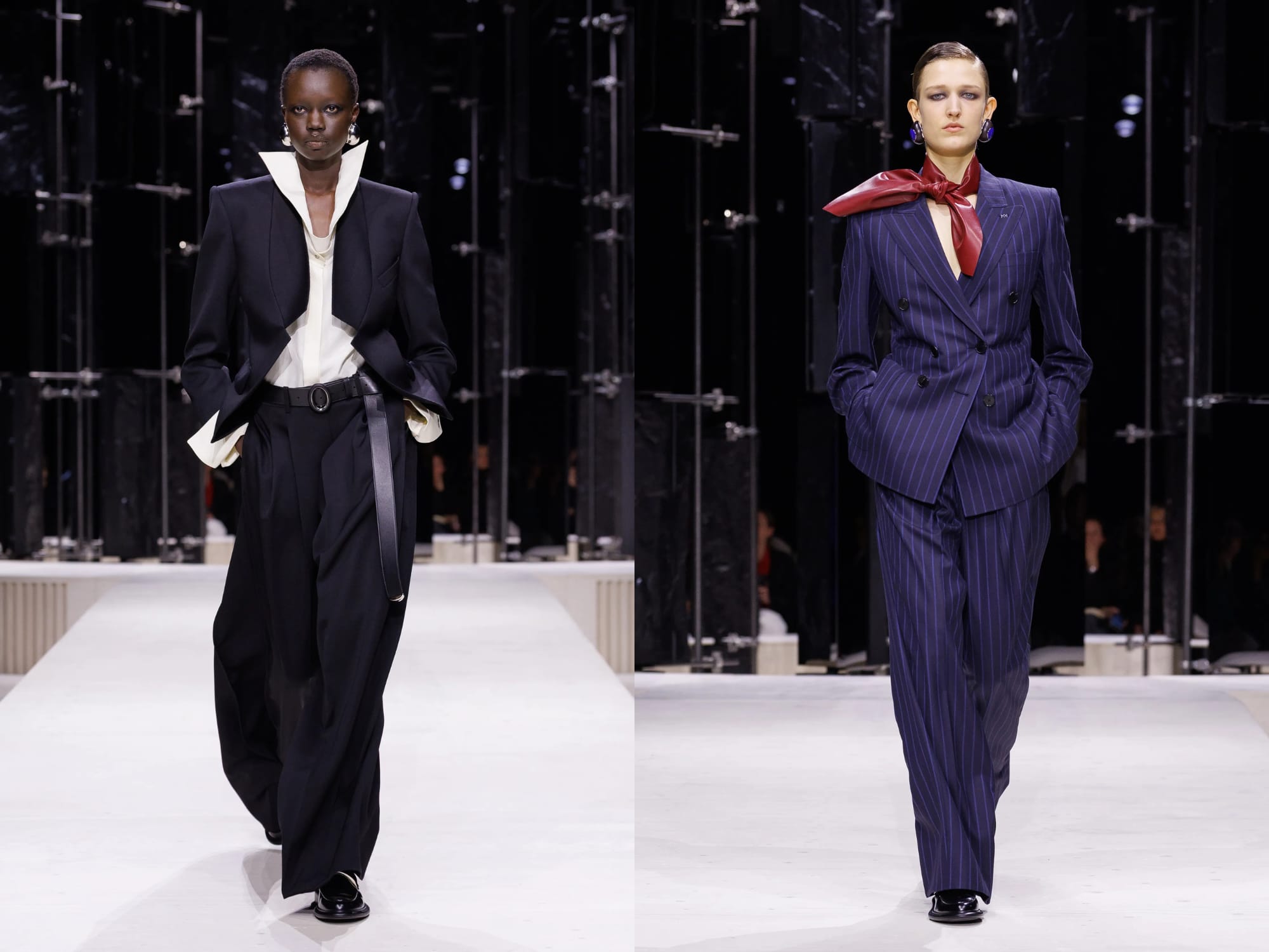 Tinh thần đa dạng đó thể hiện ngay trong cách Burton xử lý tailoring. Những bộ suit kẻ sọc nam tính được cắt may sắc sảo nhưng không cứng nhắc, trong khi các thiết kế khác nhấn mạnh đường cong bằng peplum hoặc vòng eo siết gọn. Một trong những bộ trang phục gây ấn tượng mạnh nhất trên sàn diễn là bộ tuxedo kết hợp với chiếc áo khoác dạ dài sắc nét, vai dựng cao và phom dáng chuẩn xác đến từng chi tiết. Bên cạnh đó, Burton cũng mang đến những cách tiếp cận mềm mại hơn với áo velvet halter đỏ drape nhẹ kết hợp cùng quần rộng có nếp gấp đôi, hay váy slip velvet cắt xẻ bất đối xứng, gợi cảm nhưng không phô trương.