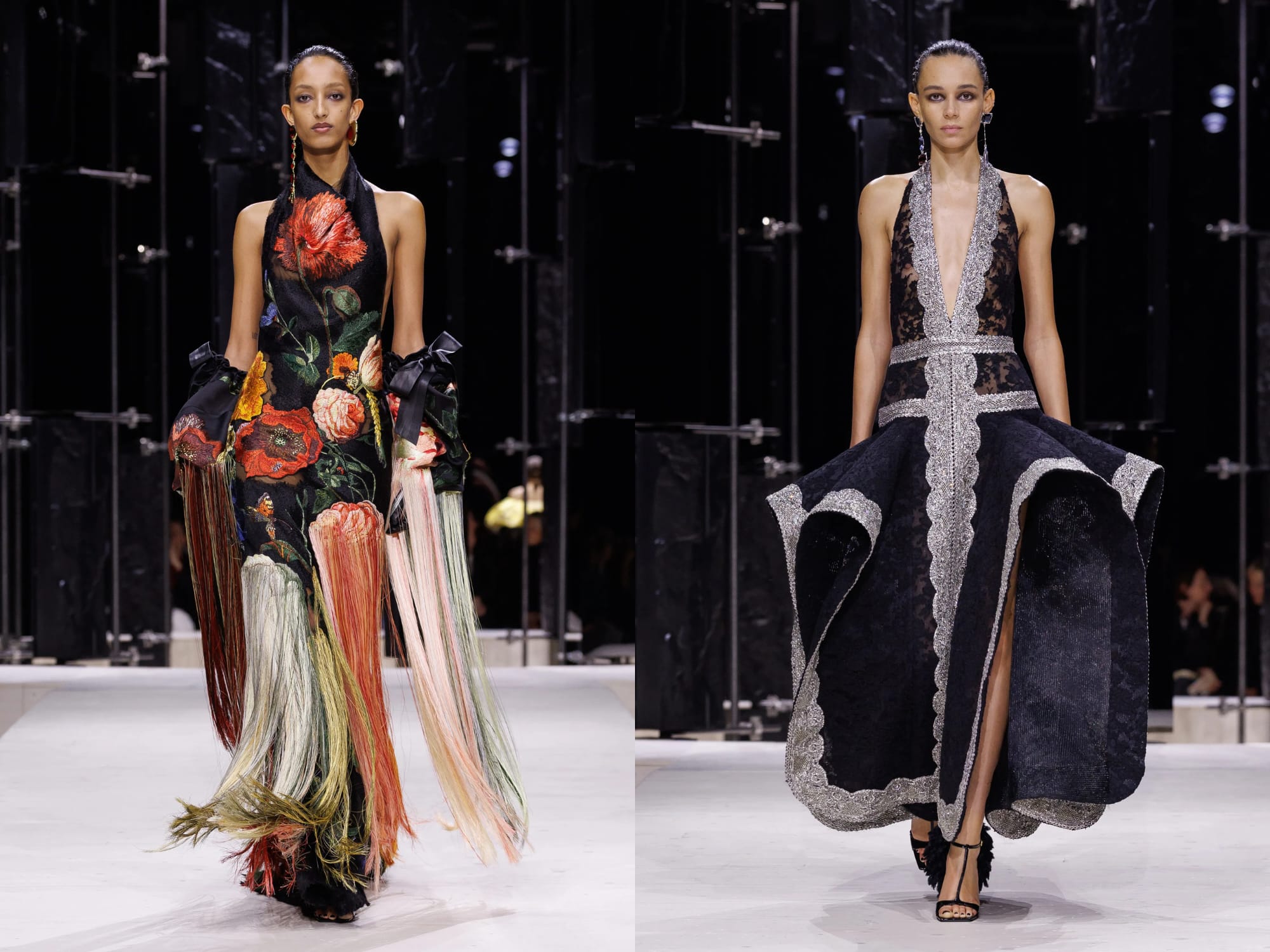 Bộ sưu tập còn mở rộng bảng chất liệu theo hướng phong phú hơn bao giờ hết. Burton kết hợp vải menswear truyền thống với nhung, ren, lụa kimono, họa tiết da báo và những chất liệu lông xù đầy kịch tính. Một chiếc áo khoác shearling xanh lam rộng và mềm như áo choàng mang lại cảm giác ấm áp giữa không khí mùa thu, trong khi các thiết kế ren và lụa thêu tinh xảo mang lại nét lãng mạn đặc trưng của Givenchy. Đặc biệt ấn tượng là chiếc váy đen thêu hoa poppy rực rỡ với những sợi fringe lụa dài gần chạm sàn, khiến người mẫu trông như bước ra từ một bức tranh hoa cổ điển.