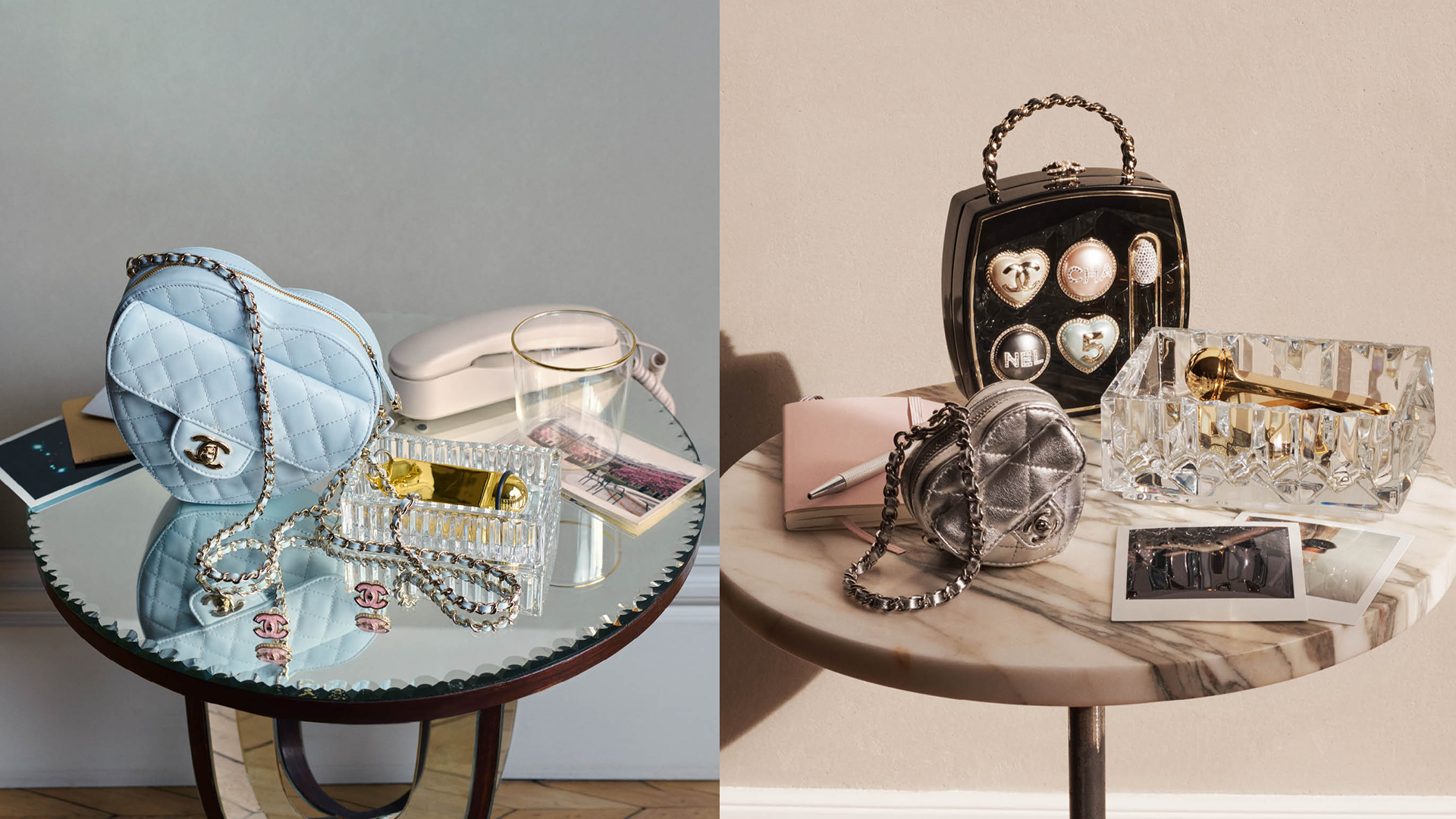 Phụ kiện đi kèm cũng phản ánh sự mềm mại và thoải mái. Lấy cảm hứng từ bảng phấn trang điểm biểu tượng của nhà mốt với túi hình trái tim chần bông màu pastel hay ví cầm tay minaudière mang đến sự nữ tính và thanh lịch.