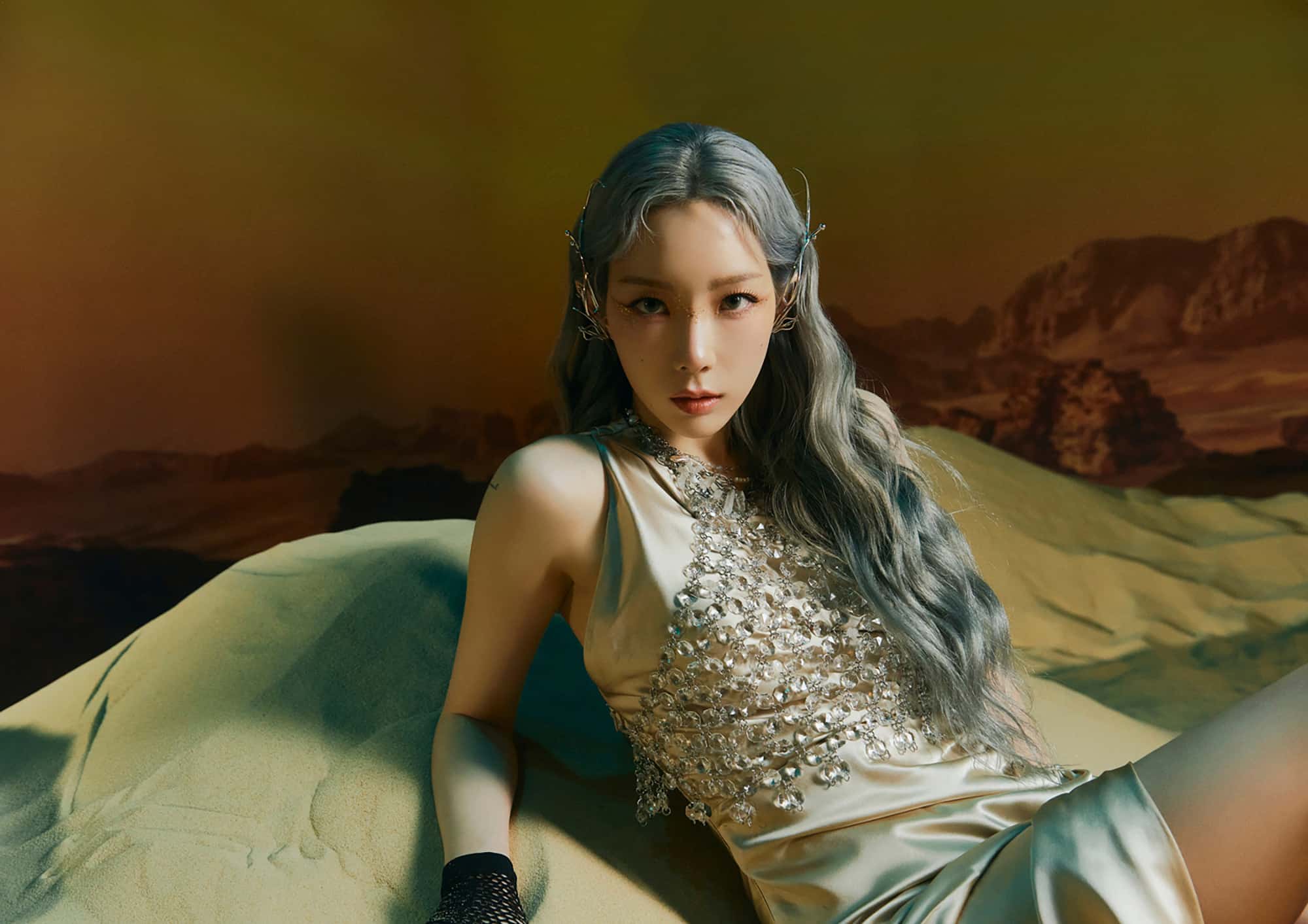 Cô gái với mái tóc màu tro xám đang tạo dáng trên đồi cát vàng