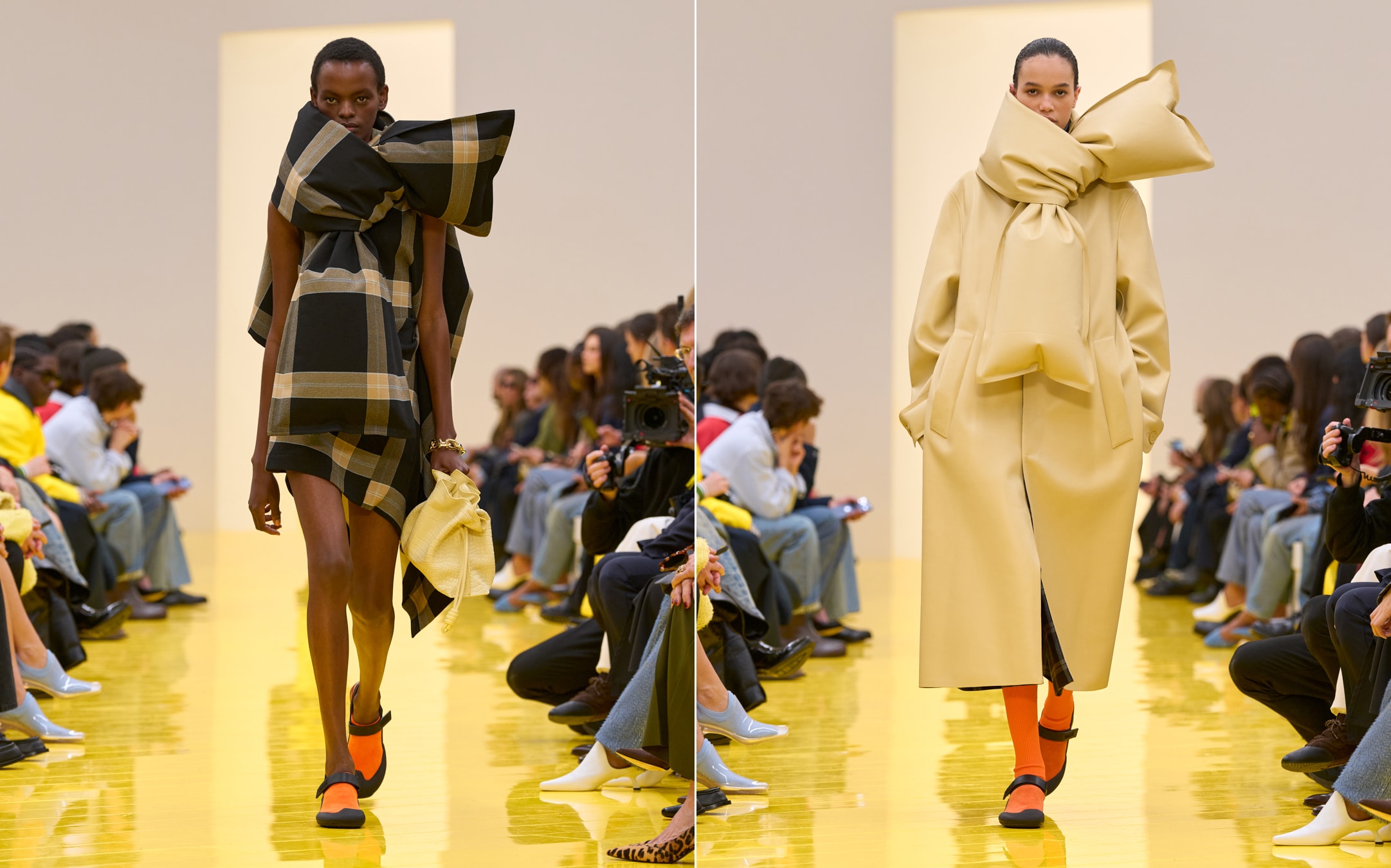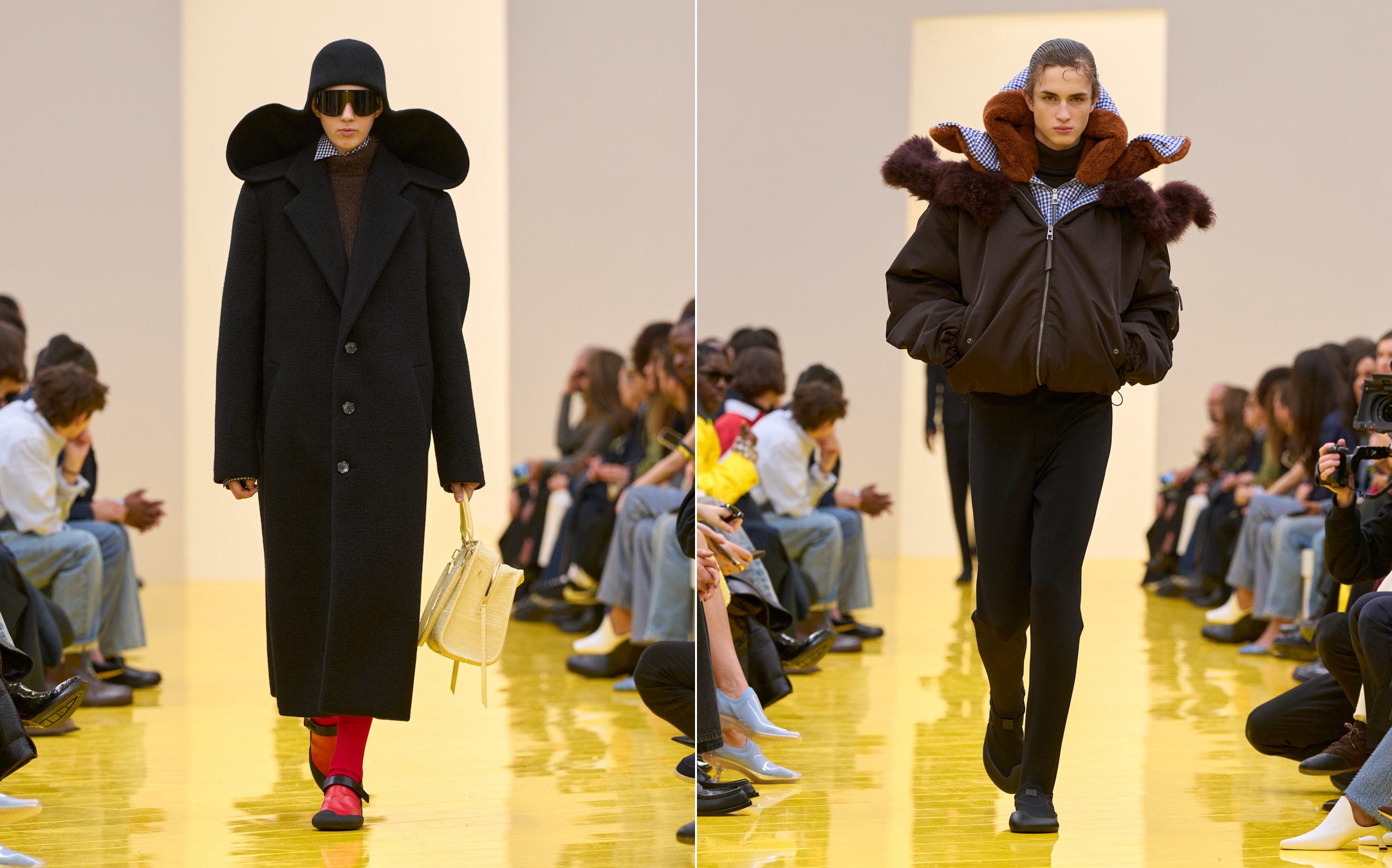 Sự hóm hỉnh của bộ đôi còn được thể hiện qua những cấu trúc thổi phồng ngẫu hứng, đẩy trang phục sang ngưỡng kịch tính lý thú. Những chiếc áo parka hay khăn quàng cổ căng phồng như những quả khinh khí cầu nhờ quy trình cắt laser và liên kết nhiệt kín khí. Một tư duy thiết kế công phu và cấp tiến.