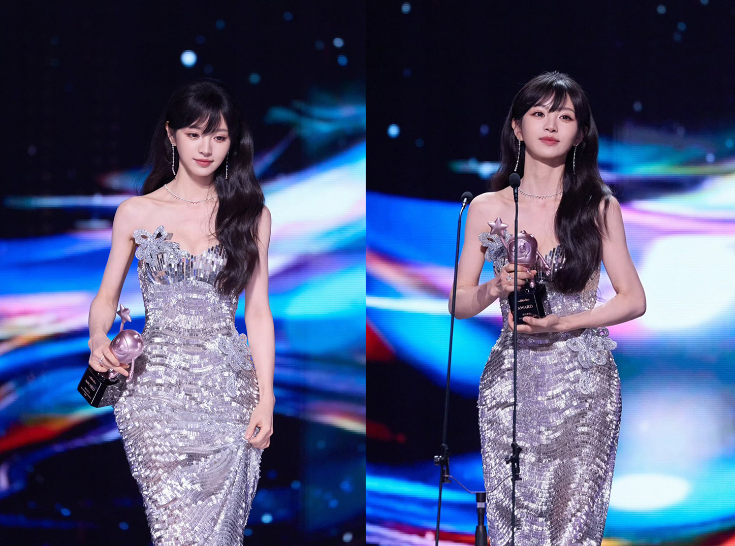 Đặc biệt, khi xuất hiện trên sân khấu để nhận giải thưởng Diễn viên được yêu thích nhất khu vực châu Á – Thái Bình Dương, Điền Hi Vi đã lựa chọn trang phục nằm trong bộ sưu tập ‘Wings of Light’ vừa được nhà mốt Việt Tralinh ra mắt tại Sanya Bridal Fashion Week.