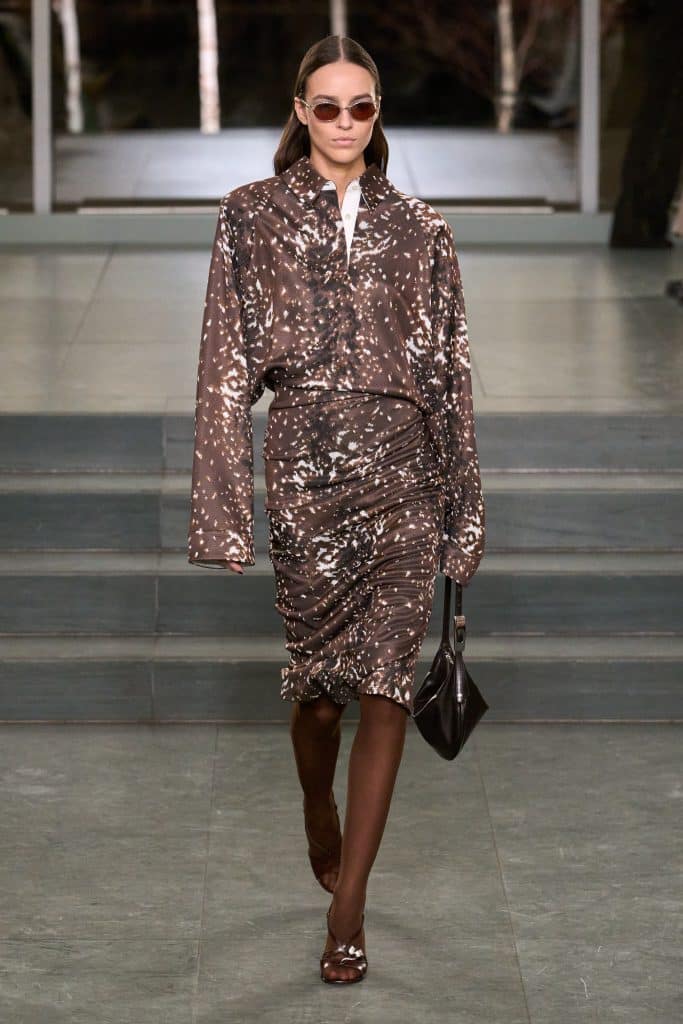 Sàn diễn Thu – Đông 2025 chứng kiến sự trỗi dậy mạnh mẽ của phong cách corp-core (công sở), với bộ vest kèm chân váy midi là điểm nhấn. Các nhà thiết kế như Calvin Klein và Tory Burch đã mang đến những bộ suit lấy cảm hứng từ thập niên 80, được “nâng cấp” để phù hợp với phụ nữ hiện đại. Những thiết kế kết hợp vẻ hoài cổ với tinh thần tối giản, tập trung vào đường cắt gọn gàng cùng tông màu trung tính. Chân váy midi phối cùng áo khoác đứng phom tạo nên một tổng thể vừa linh hoạt, vừa tinh tế, thể hiện phong thái sang trọng đặc trưng của New York. Sự lên ngôi của chân váy midi trên sàn runway không chỉ là một xu hướng nhất thời, mà còn phản ánh sự chuyển mình trong thời trang công sở. Ngày nay, họ vừa tìm kiếm sự tiện dụng, vừa đề cao việc thể hiện cá tính qua trang phục.