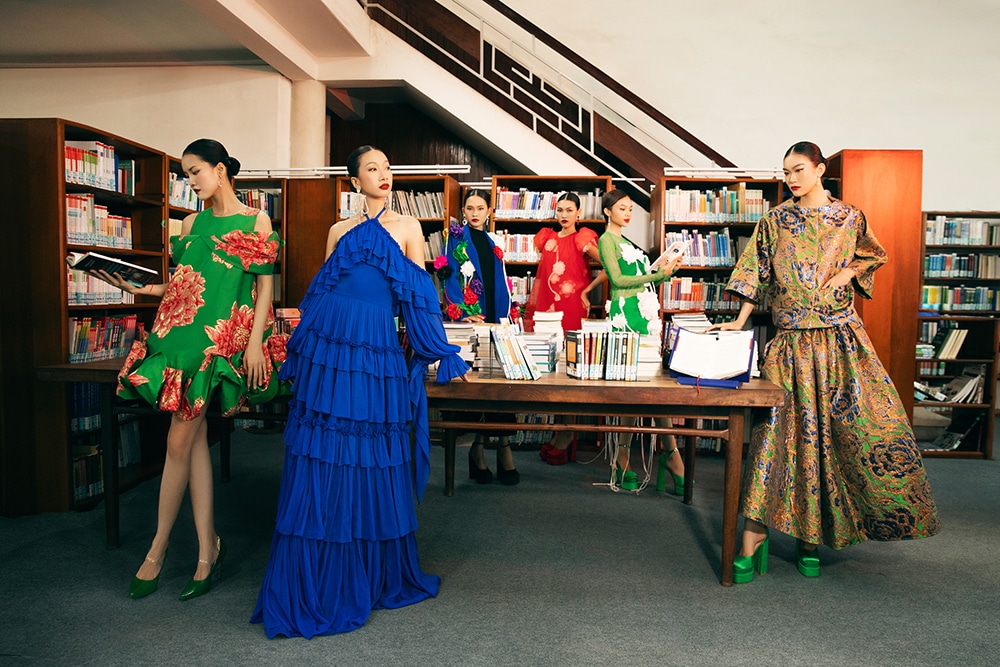 Hóa thân thành các cặp nam thanh nữ tú, dàn siêu mẫu diện thiết kế đầm ngắn cape bay bổng đính kết hoa thược dược mang lại không khí tươi vui của tuổi trẻ. Những thiết kế như scarf dress bay bổng, suit oversize, váy bubble dress bồng bềnh cùng những chiếc áo dài đính họa tiết hoa thược dược và linh vật năm Ất Tị càng góp phần tạo nên một bức tranh xuân đầy màu sắc.