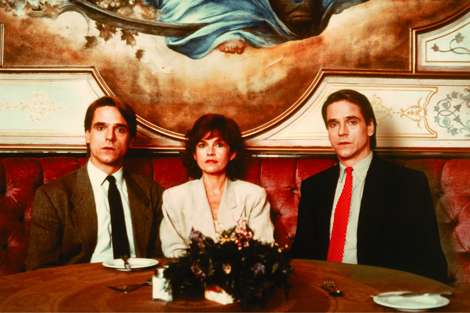 Ba nhân vật ngồi đối diện trong một nhà hàng sang trọng với tranh tường phía sau