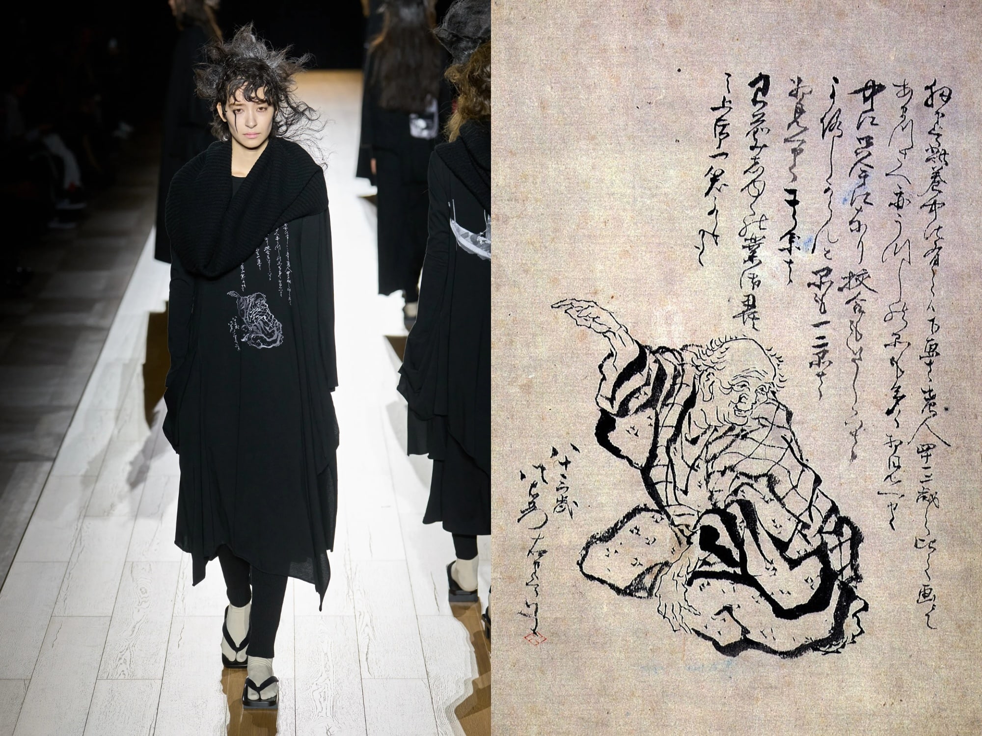 Nguồn cảm hứng nghệ thuật rõ ràng nhất của mùa này đến từ Katsushika Hokusai, danh họa ukiyo-e thời Edo. Những bản in và nét vẽ của Hokusai xuất hiện rải rác trong bộ sưu tập, đặc biệt ở năm look cuối cùng, phần kết quen thuộc của Yamamoto thay cho màn kết thúc truyền thống. Trên nền đen đặc trưng, các hình ảnh từ Hokusai mang đến những điểm nhấn thị giác sống động, như những mảnh ký ức lịch sử chen vào dòng chảy đương đại. Yamamoto từng nói ông thấy tác phẩm của Hokusai “rất kích thích và đầy bất ngờ”, bởi họa sĩ này vẫn sáng tác không ngừng cho tới cuối đời, đồng thời ảnh hưởng sâu sắc đến nghệ thuật châu Âu thông qua phong trào Japonisme.